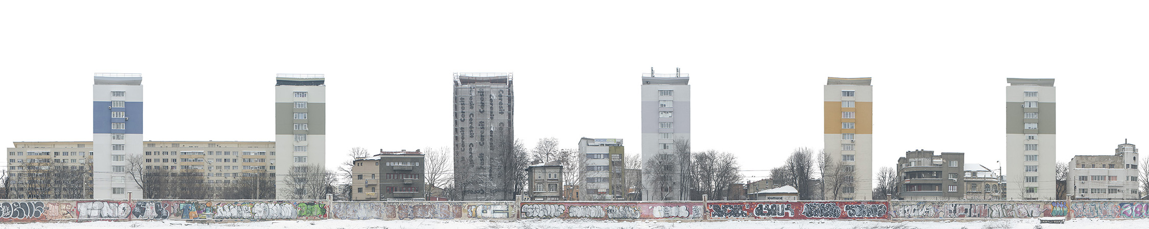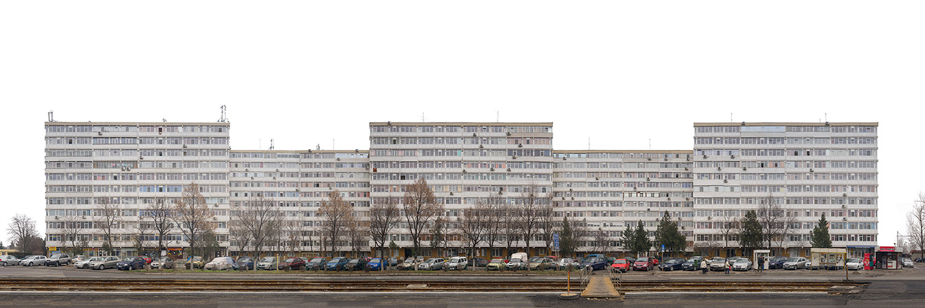 Stemming from my training as an architect, I have employed the same technique required by street front studies used in urban planning in order to create this series of images. ‘Blocks of Flats’ is meant to be seen both as an exploration of the rapid visual decay of the current urban milieu, as well as a method of documenting their repetitiveness and architectural rigour. Constructed as photographic montages, these images are not meant to overstate reality. On the contrary, the resulting photographs show a hidden reality that is otherwise invisible to the naked eye, digitally recomposing the complete facade of these large communist housing units.